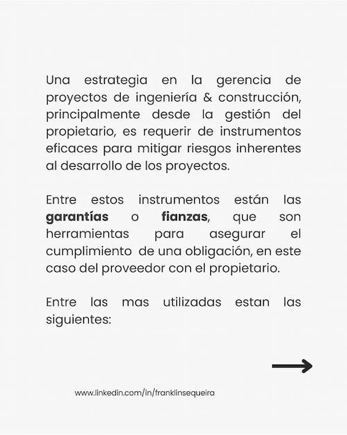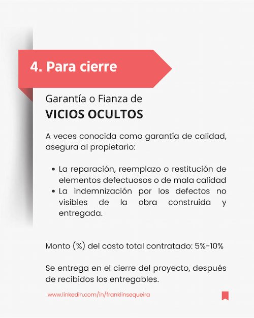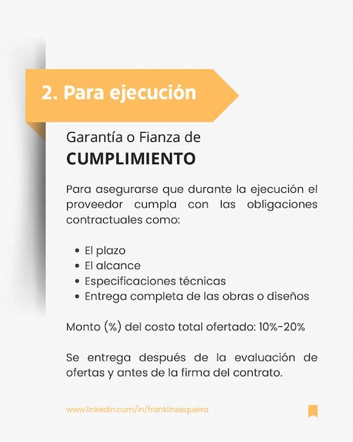 - Garantía o Fianza de cumplimiento: para asegurarse que el proveedor cumpla con el contrato, el plazo, el alcance, la entrega de valor, los entregables, y las obras o ingenierías por la que fue contratado.