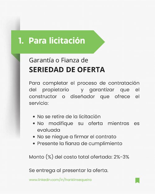- Garantía o Fianza de seriedad de la oferta: Es para garantizar que el constructor o diseñador que ofrece el servicio no retire o modifique su oferta mientras es evaluada, o si llegara a ganar que no se niegue a firmar el contrato, o asegurar la entrega de la fianza de cumplimiento.