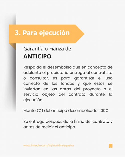 - Garantía o Fianza de anticipo: respalda el desembolso del anticipo del propietario al contratista o consultor, es para garantizar que los fondos se inviertan en las obras del proyecto o el servicio objeto del contrato.