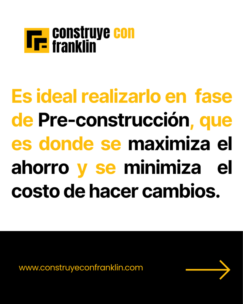 ¿Cuándo se realiza? Aunque se puede realizar a lo largo del ciclo de vida del proyecto, el momento ideal es en la fase de Pre-construcción (diseño y planificación). Es aquí donde el impacto en el ahorro es máximo y el costo de implementar cambios es mínimo.